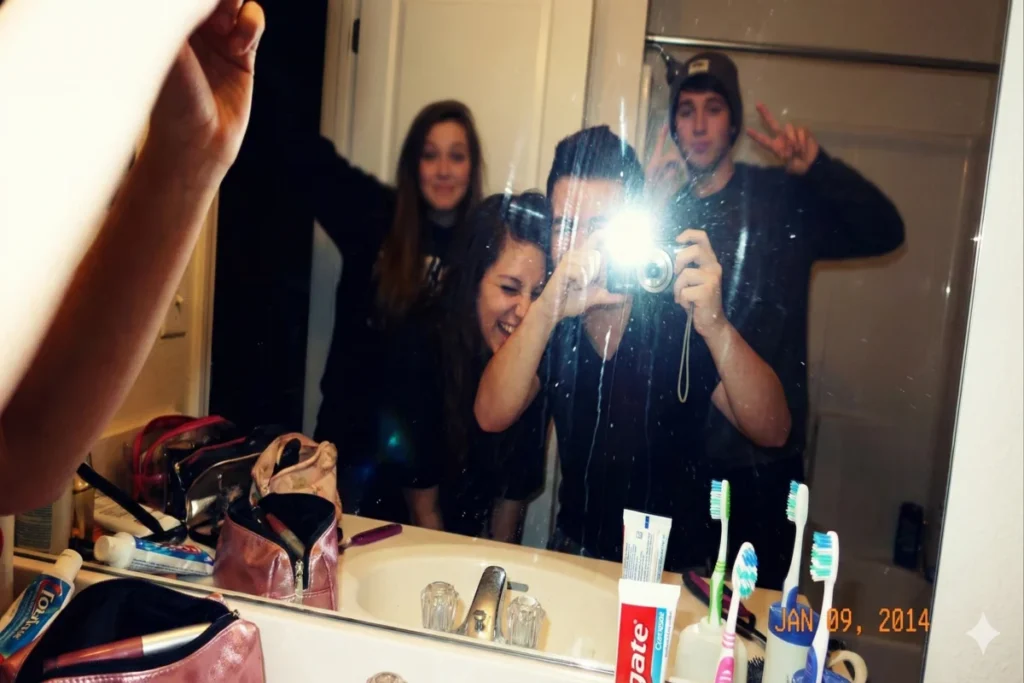 “Chaotic bathroom mirror selfie with 4 friends squeezed into frame. One friend holding the phone with flash on, streaks on the mirror, cluttered sink with makeup and toothbrushes, someone slightly out of focus in the back doing a peace sign. Overexposed highlights, awkward crop cutting off heads, early 2010s Instagram energy.”