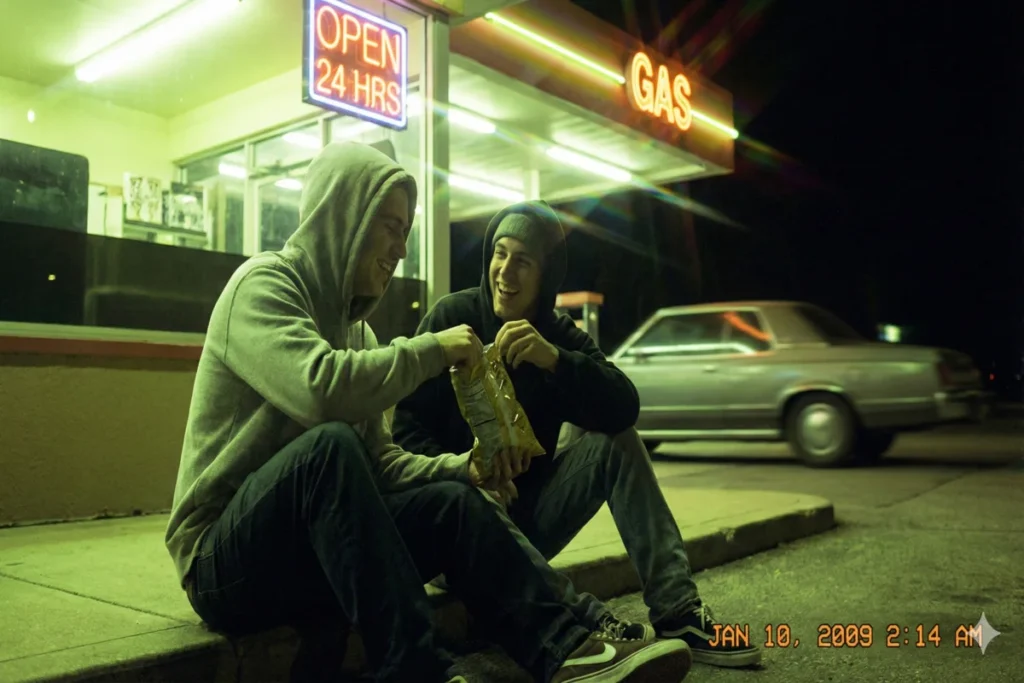 “Low-res nighttime photo at a gas station at 2AM. Two friends sitting on the curb eating chips, neon lights flickering above, one car in the background slightly out of focus. Strong greenish fluorescent tint, digital noise in the shadows, lens flare streaks, feels like a random pic from a lost Facebook album.”