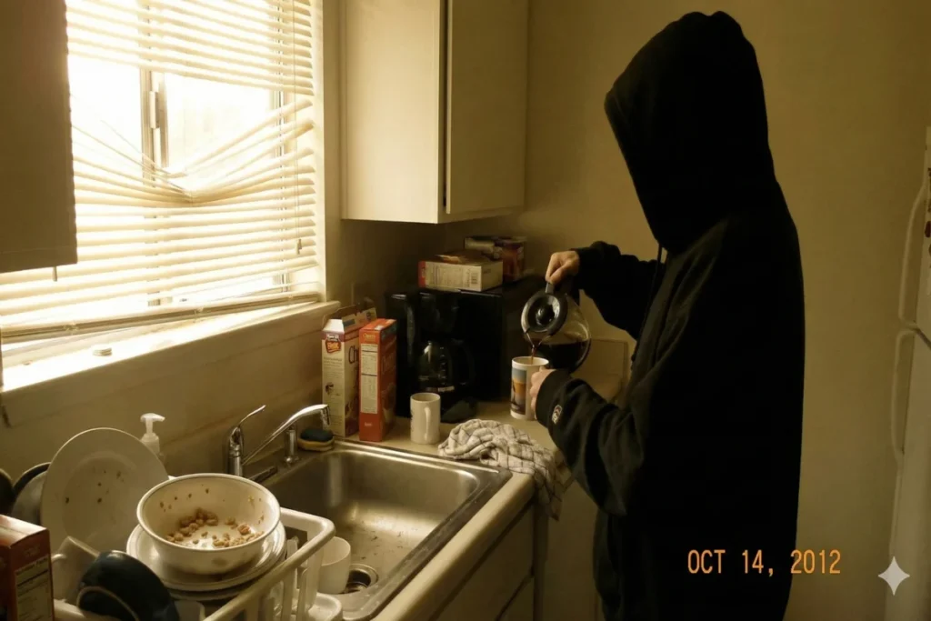 “Candid morning photo in a small, messy apartment kitchen. Sunlight leaking through cheap blinds, unmade cereal bowl in the sink, someone in an oversized hoodie pouring coffee, face partially out of frame. Soft blur, slightly crooked horizon, warm white balance, looks like it was shot on an old phone in 2012.”